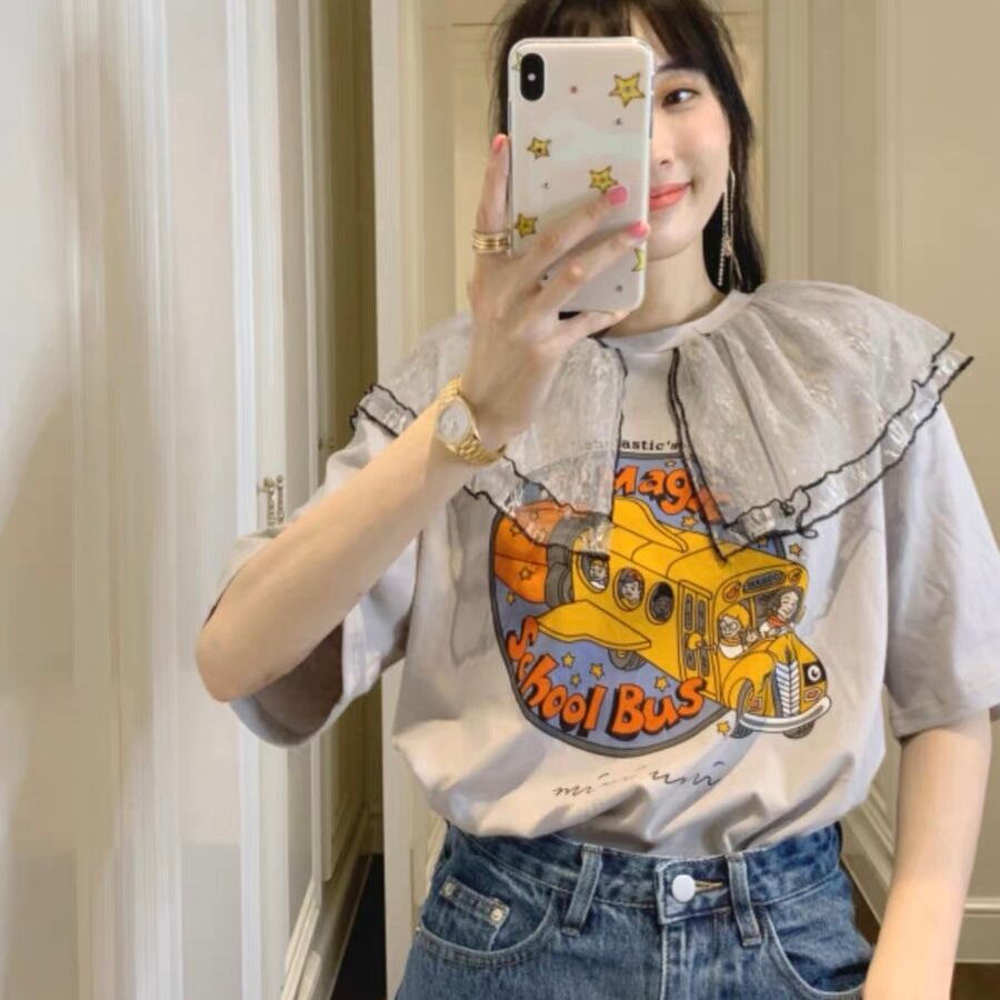 TS-0080 フリル襟付き レトロ ユニーク バス イラスト 半袖 Tシャツ トップス レディース カジュアル シンプル 可愛い 上品 お洒落 きれいめ