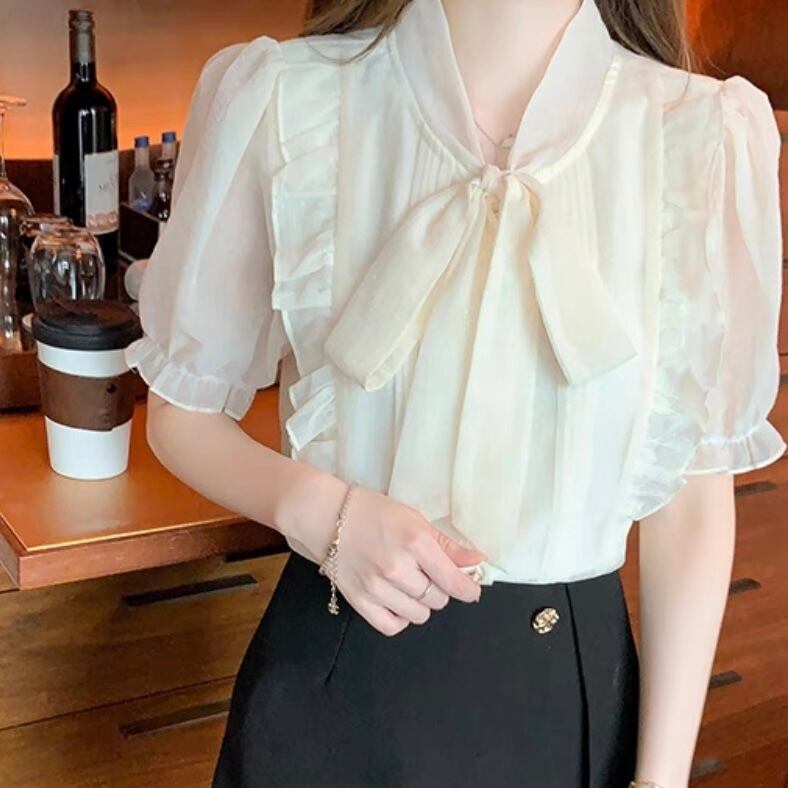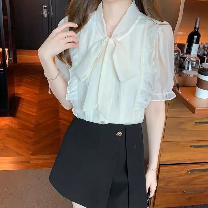 TS-0094 半袖 リボン ブラウス トップス レディース カジュアル シンプル 可愛い 上品 お洒落 きれいめ