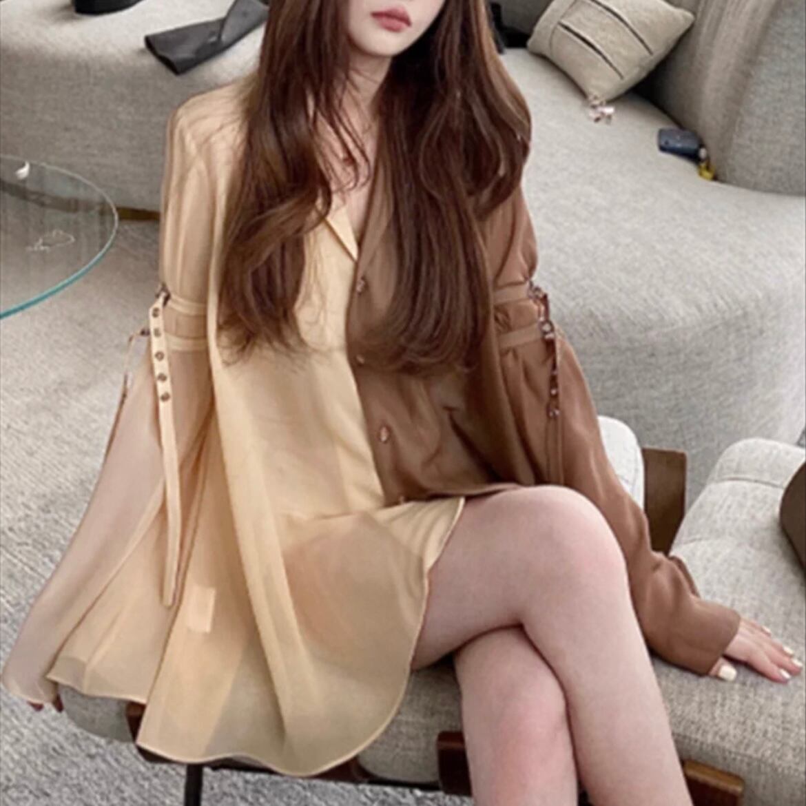 BL-0040 バイカラー シースルー オーバー シャツ 長袖 トップス レディース カジュアル シンプル 可愛い 上品 お洒落 きれいめ
