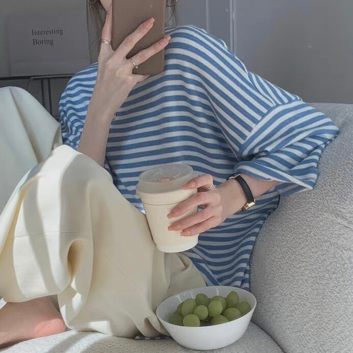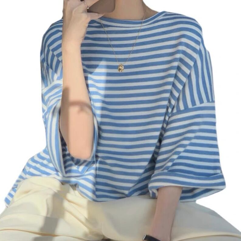 TS-0107 ストライプ ルーズフィット Tシャツ 5分丈 トップス レディース カジュアル シンプル 可愛い 上品 お洒落 きれい