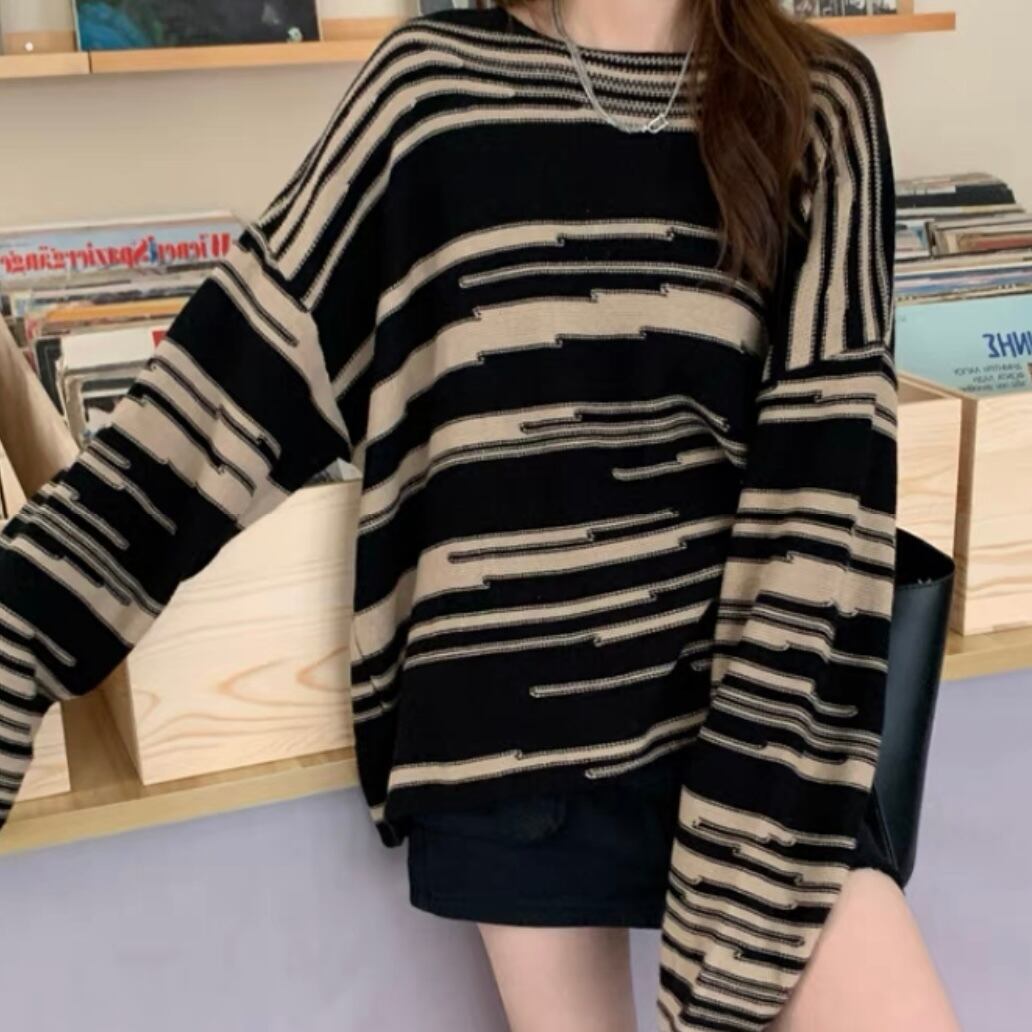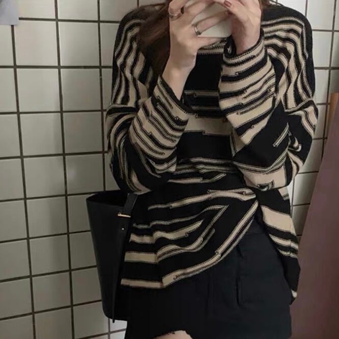TS-0116 ストライプ ニット ルーズフィット 長袖 トップス レディース カジュアル シンプル 可愛い 上品 お洒落 きれいめ