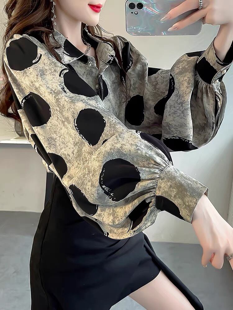 BL-0046 ランタンスリーブ 水玉柄 シャツ ブラウス 長袖 トップス レディース カジュアル シンプル 可愛い 上品 お洒落 きれいめ