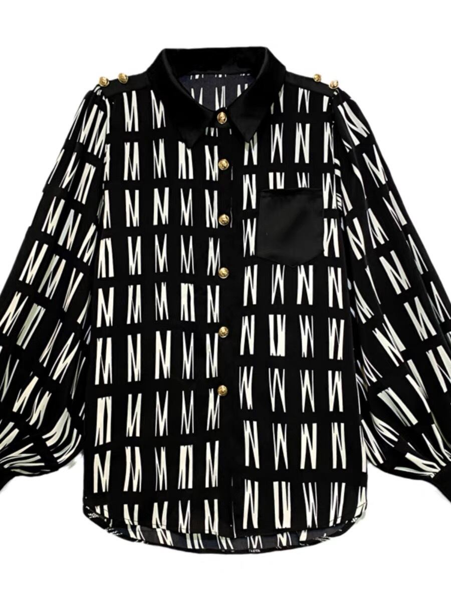 BL-0052 モノトーン ランタンスリーブ 柄 シャツ ブラウス 長袖 トップス レディース カジュアル シンプル 可愛い 上品 お洒落 きれいめ