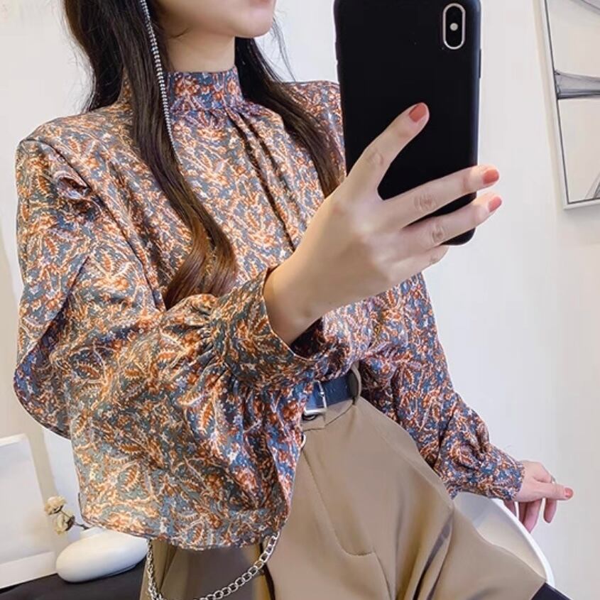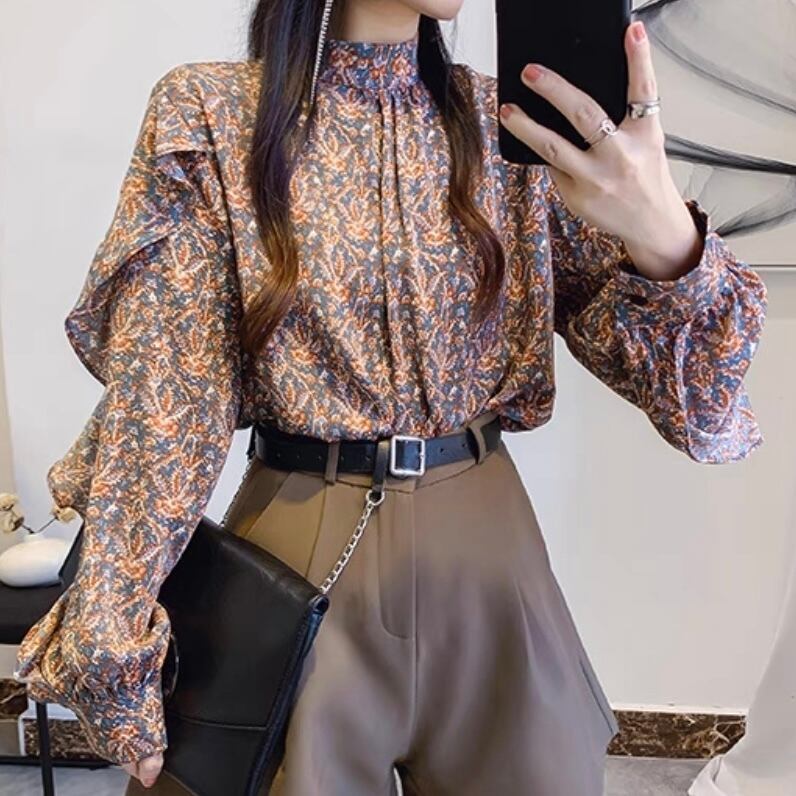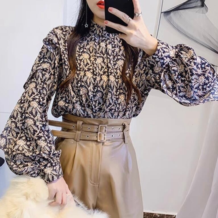 BL-0062 レトロ柄 シャツ ハイネック ランタンスリーブ ブラウス 長袖 トップス レディース カジュアル シンプル 可愛い 上品 お洒落 きれい