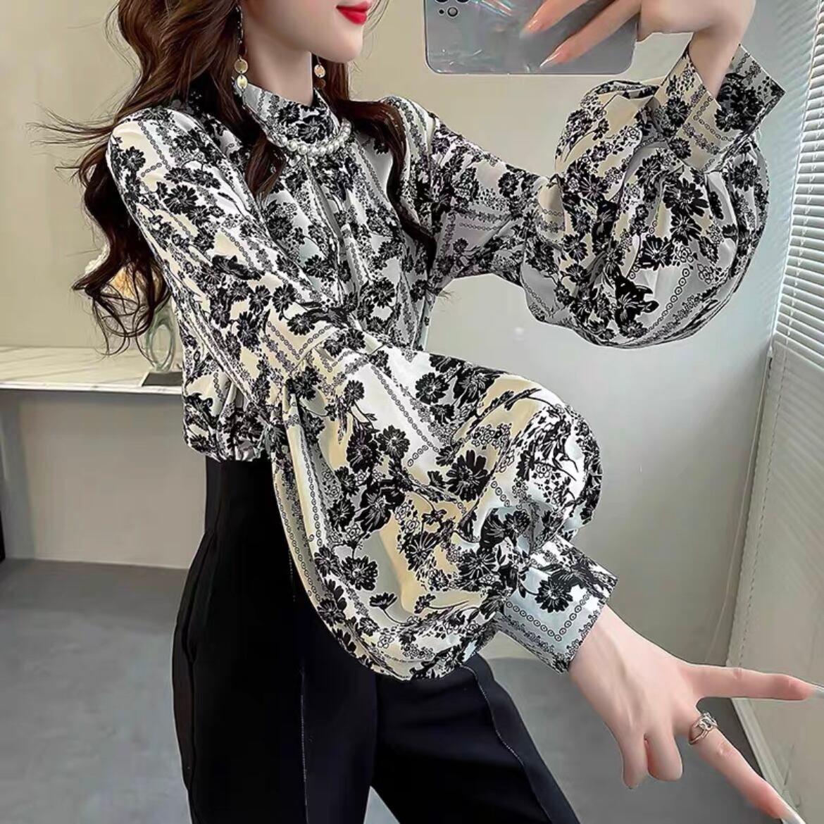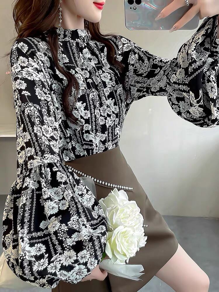 BL-0068 モノクロ 花柄 シャツ ハイネック ランタンスリーブ ブラウス 長袖 トップス レディース カジュアル シンプル 可愛い 上品 お洒落 きれいめ