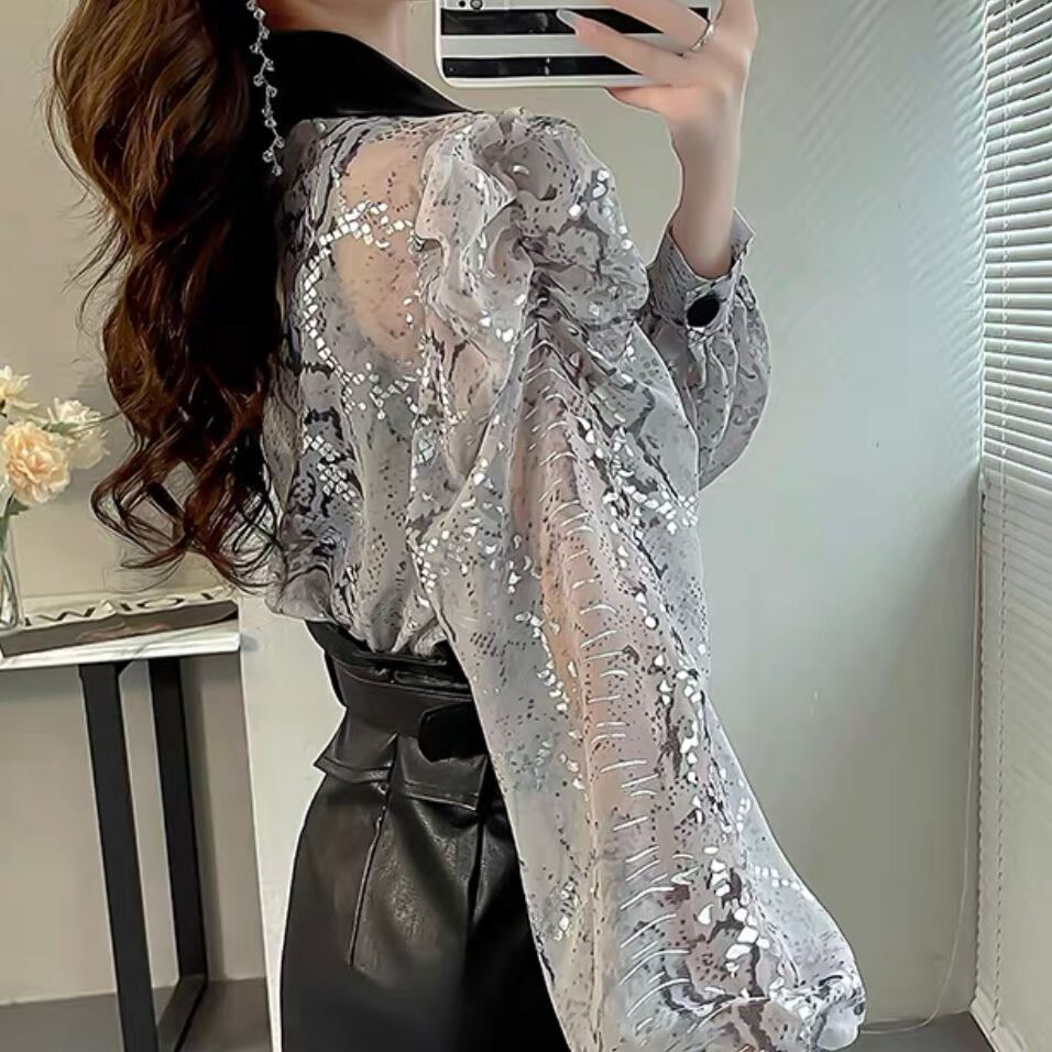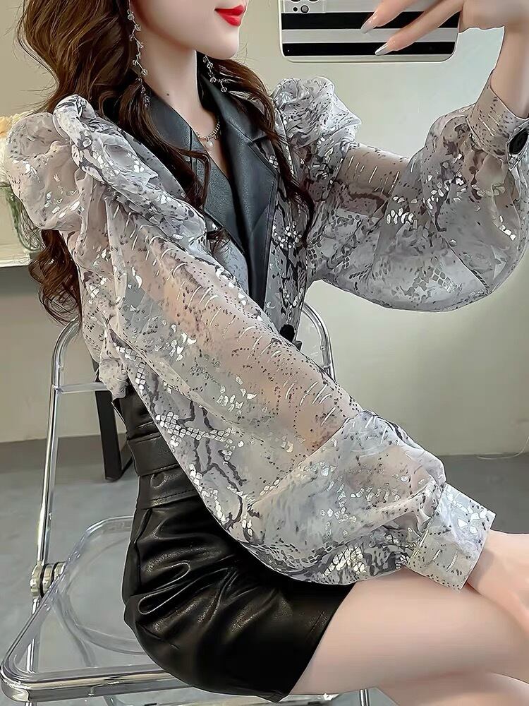 BL-0069 レザー キラキラ柄 シャツ シースルー ランタンスリーブ ブラウス 長袖 トップス レディース カジュアル シンプル 可愛い 上品 お洒落 きれいめ