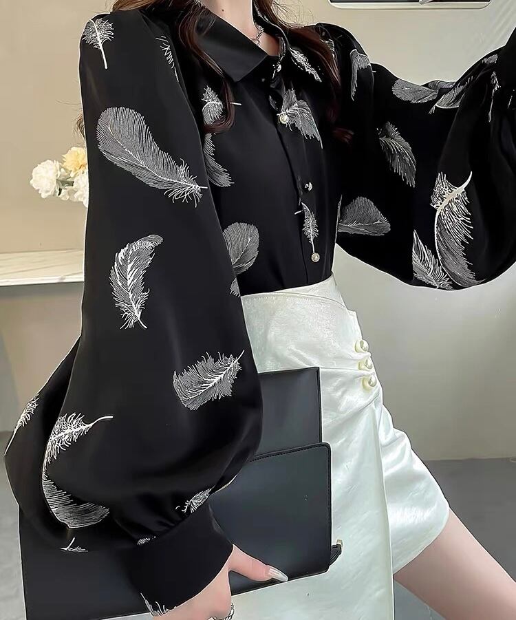 BL-0075 羽根柄 ランタンスリーブ シャツ ブラウス 長袖 トップス レディース カジュアル シンプル 可愛い 上品 お洒落 きれいめ