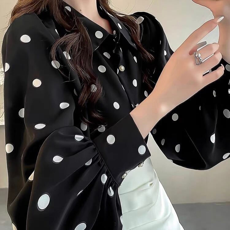 BL-0076 ドット柄 ランタンスリーブ シャツ ブラウス 長袖 トップス レディース カジュアル シンプル 可愛い 上品 お洒落 きれいめ
