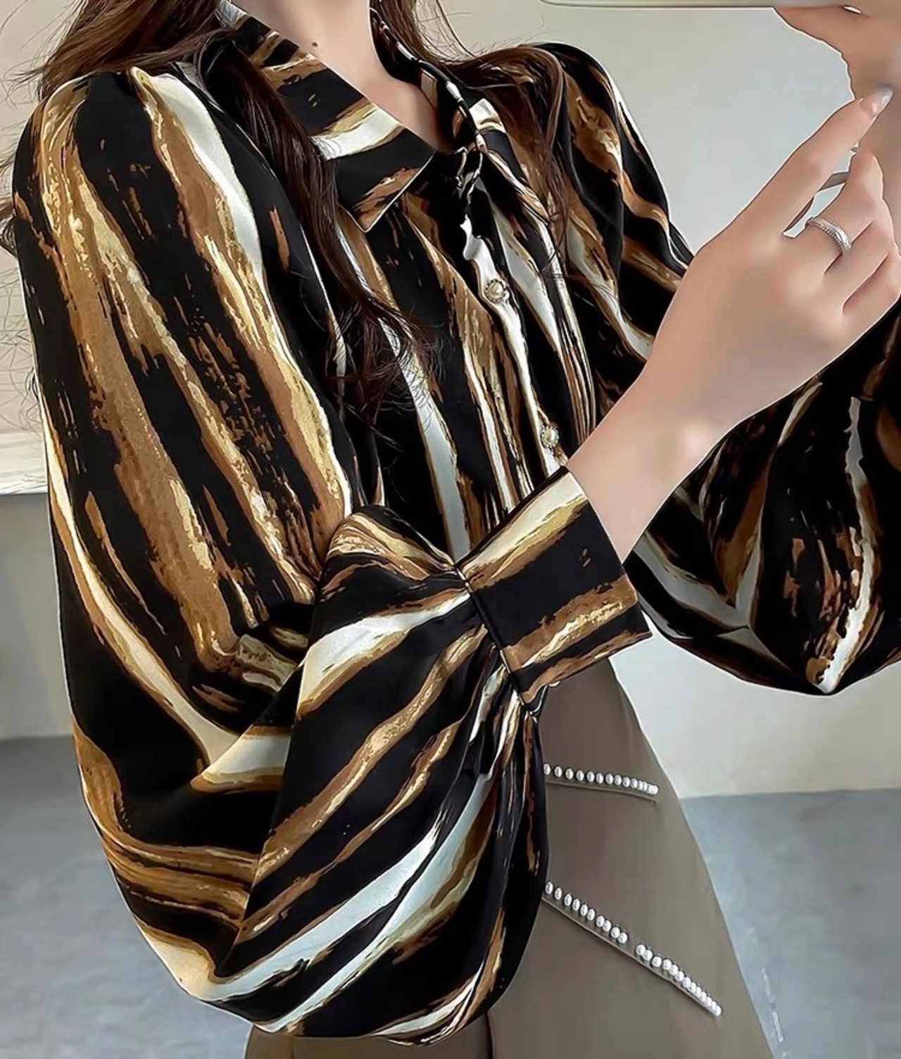 BL-0079 シック ストライプ柄 ランタンスリーブ シャツ ブラウス 長袖 トップス レディース カジュアル シンプル 可愛い 上品 お洒落 きれいめ