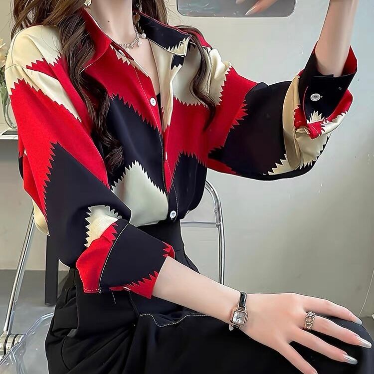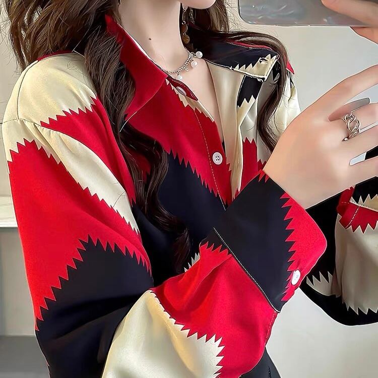BL-0082 トリプルカラー ギザギザ 柄 シャツ ブラウス 長袖 トップス レディース カジュアル シンプル 可愛い 上品 お洒落 きれいめ