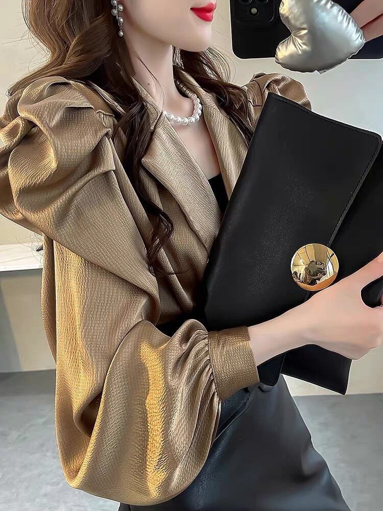 BL-0087 ゴールド パフスリーブ シャツ ブラウス 長袖 トップス レディース カジュアル シンプル 可愛い 上品 お洒落 きれいめ