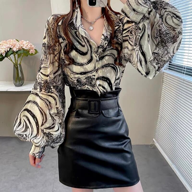 BL-0093 ゼブラ風 ランタンスリーブ シャツ ブラウス 長袖 トップス レディース カジュアル シンプル 可愛い 上品 お洒落 きれいめ