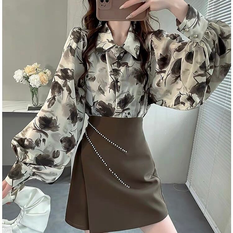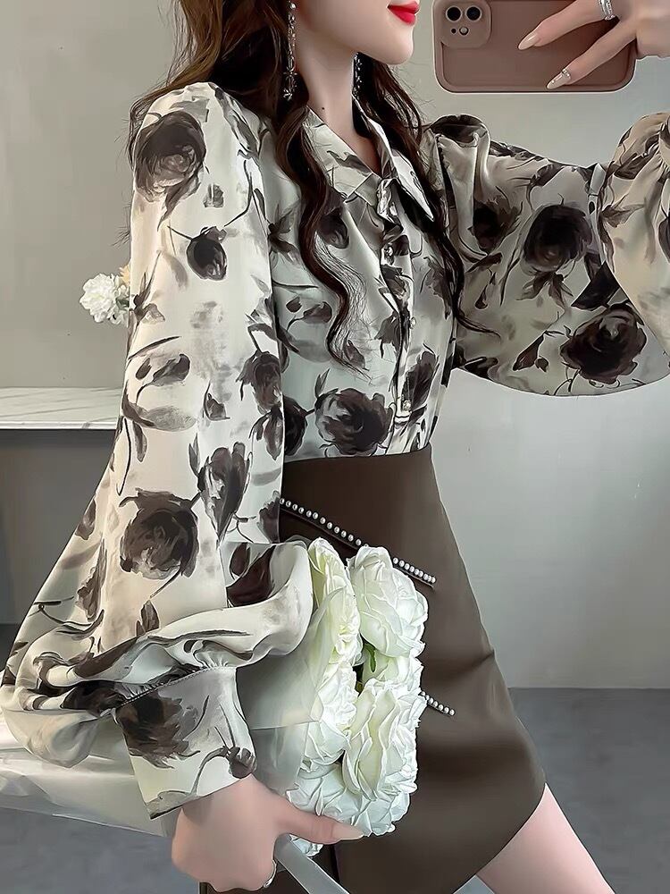 BL-0100 モノクロ 花柄 ランタンスリーブ シャツ ブラウス 長袖 トップス レディース カジュアル シンプル 可愛い 上品 お洒落 きれいめ