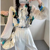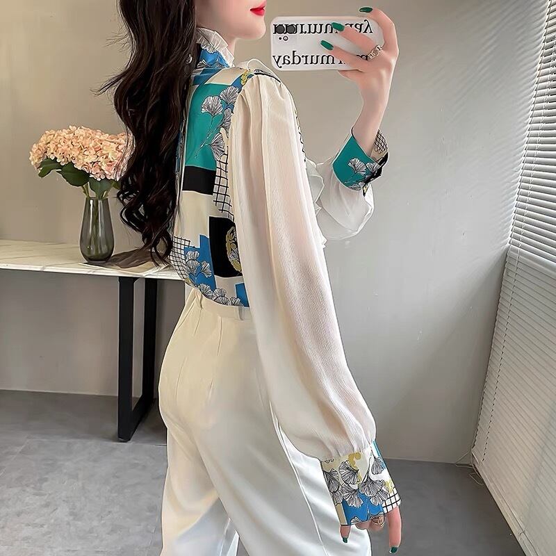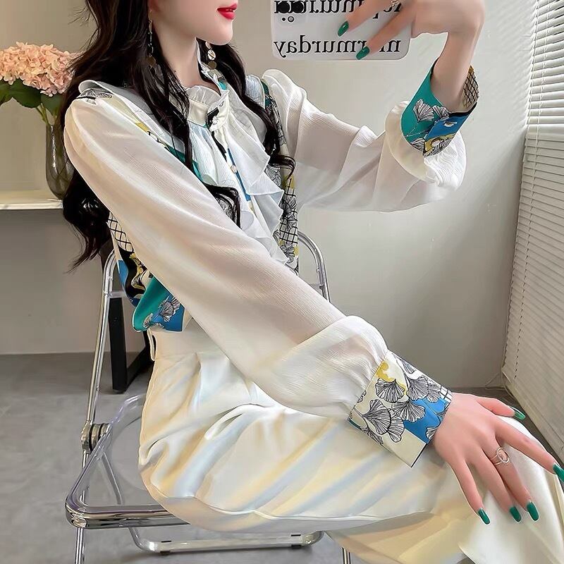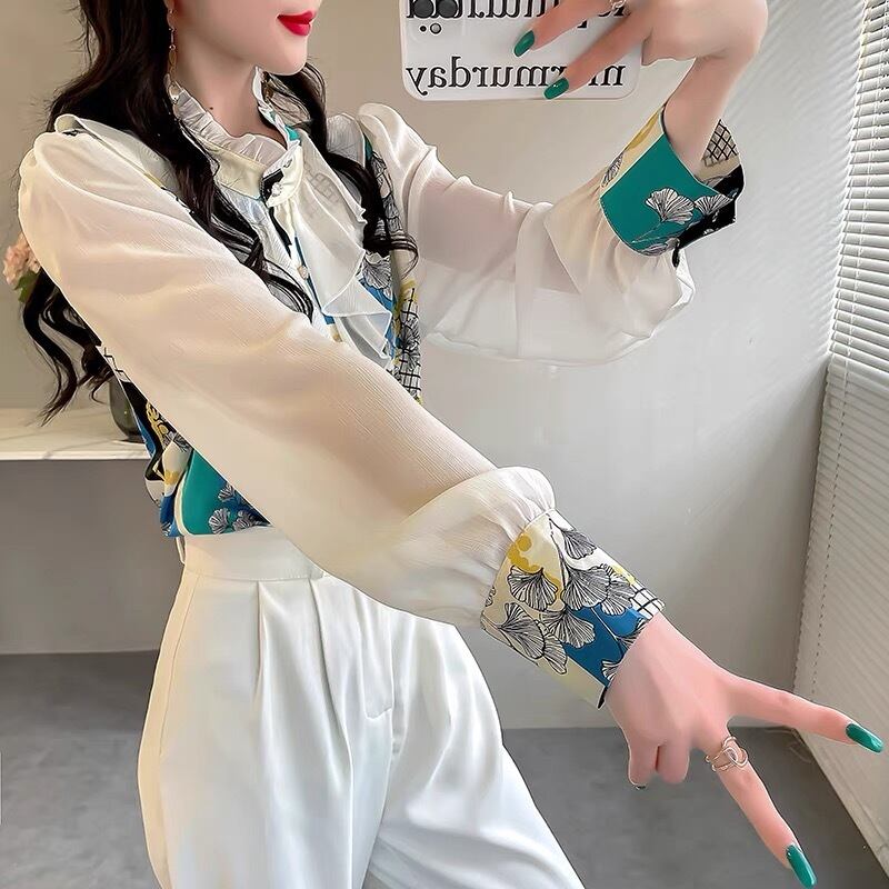 BL-0101 イチョウの葉柄 フリル ドッキング シースルーシャツ ブラウス 長袖 トップス レディース カジュアル シンプル 可愛い 上品 お洒落 きれいめ