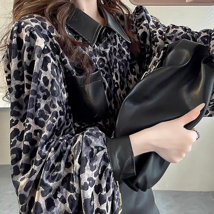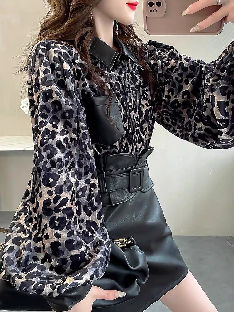 BL-0102 レザー ヒョウ柄 ランタンスリーブ シャツ ブラウス 長袖 トップス レディース カジュアル シンプル 可愛い 上品 お洒落 きれいめ