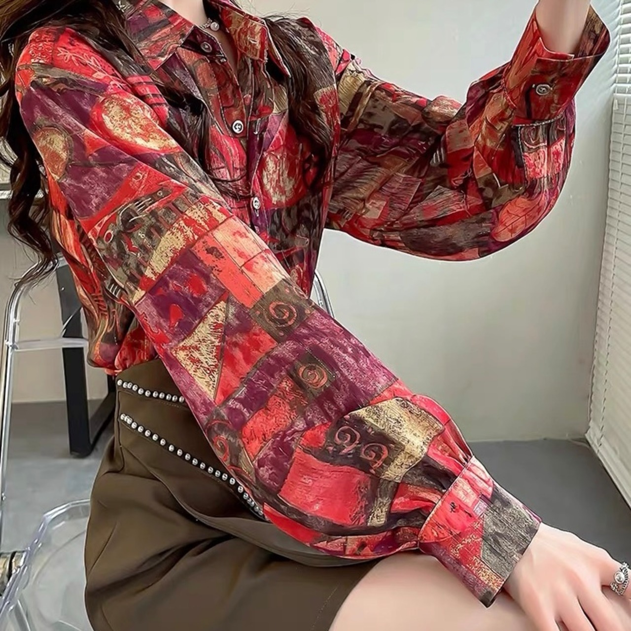 BL-0104 民族風 柄 ランタンスリーブ シャツ ブラウス 長袖 トップス レディース カジュアル シンプル 可愛い 上品 お洒落 きれいめ