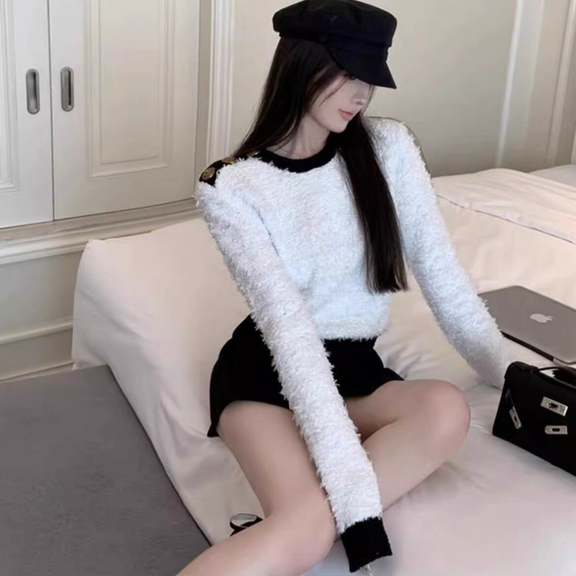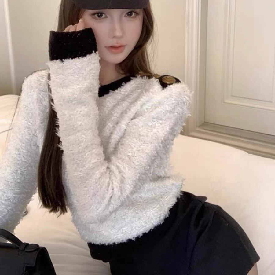 NT-0151 フレンチ ラウンドネック バイカラー 上品 ニット トップス 長袖 レディース カジュアル シンプル 可愛い お洒落 きれいめ