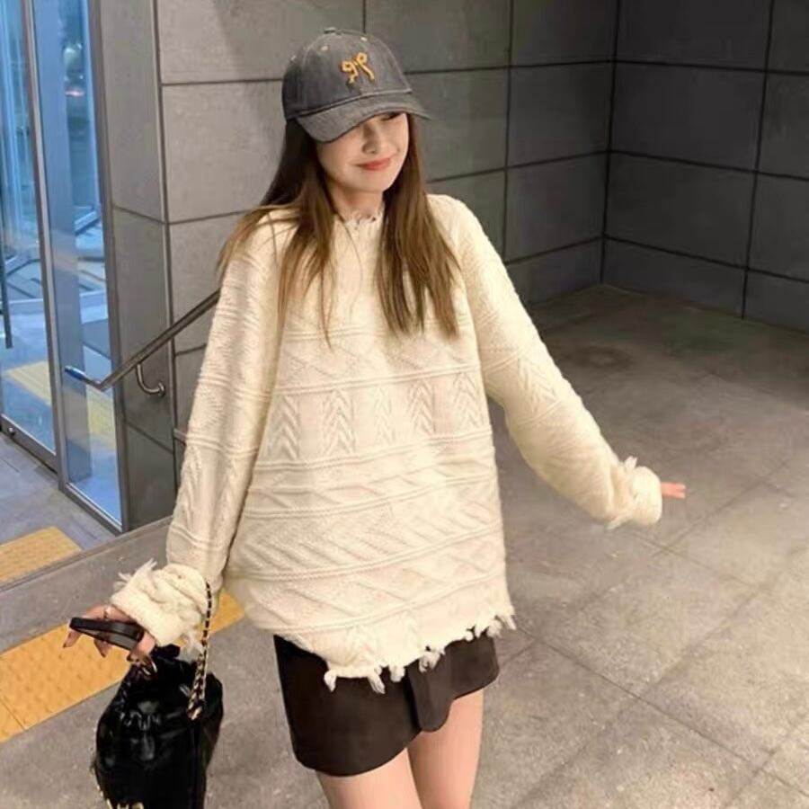 NT-0152 ノスタルジック柄 ダメージ ラウンドネック ニット トップス 長袖 レディース カジュアル シンプル 可愛い お洒落 きれいめ