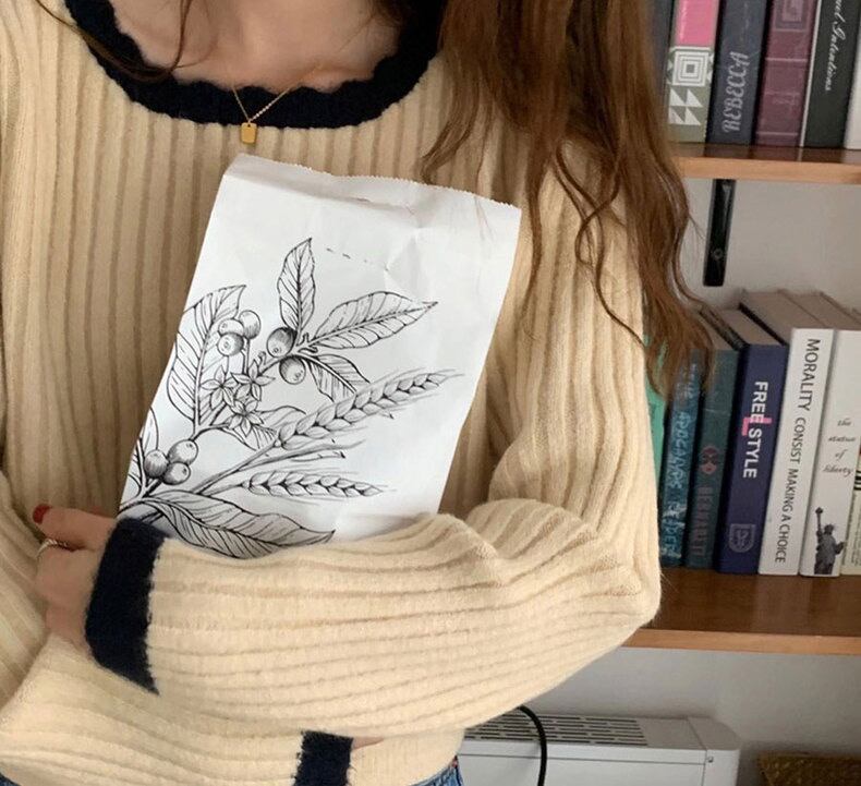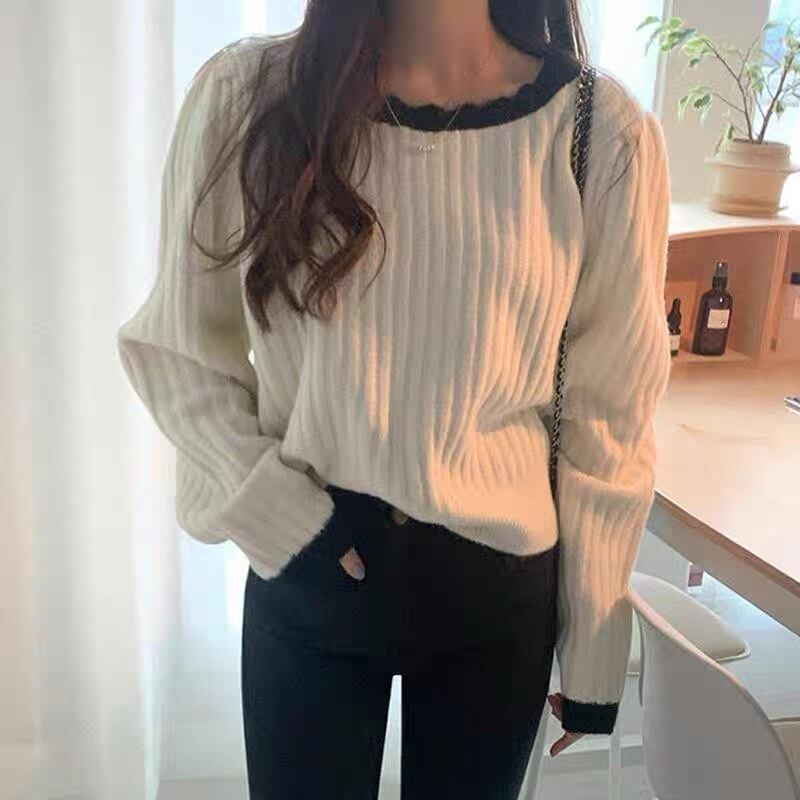 NT-0258 バイカラー ラウンドネック ニット トップス 長袖 レディース カジュアル シンプル 可愛い お洒落 きれいめ
