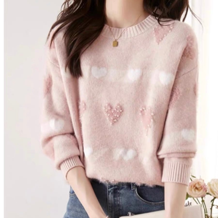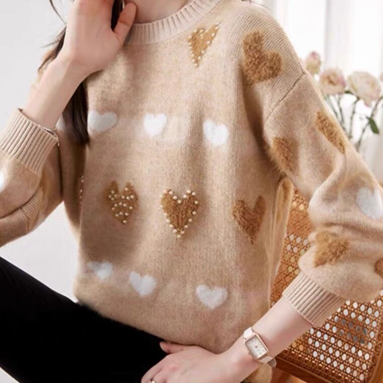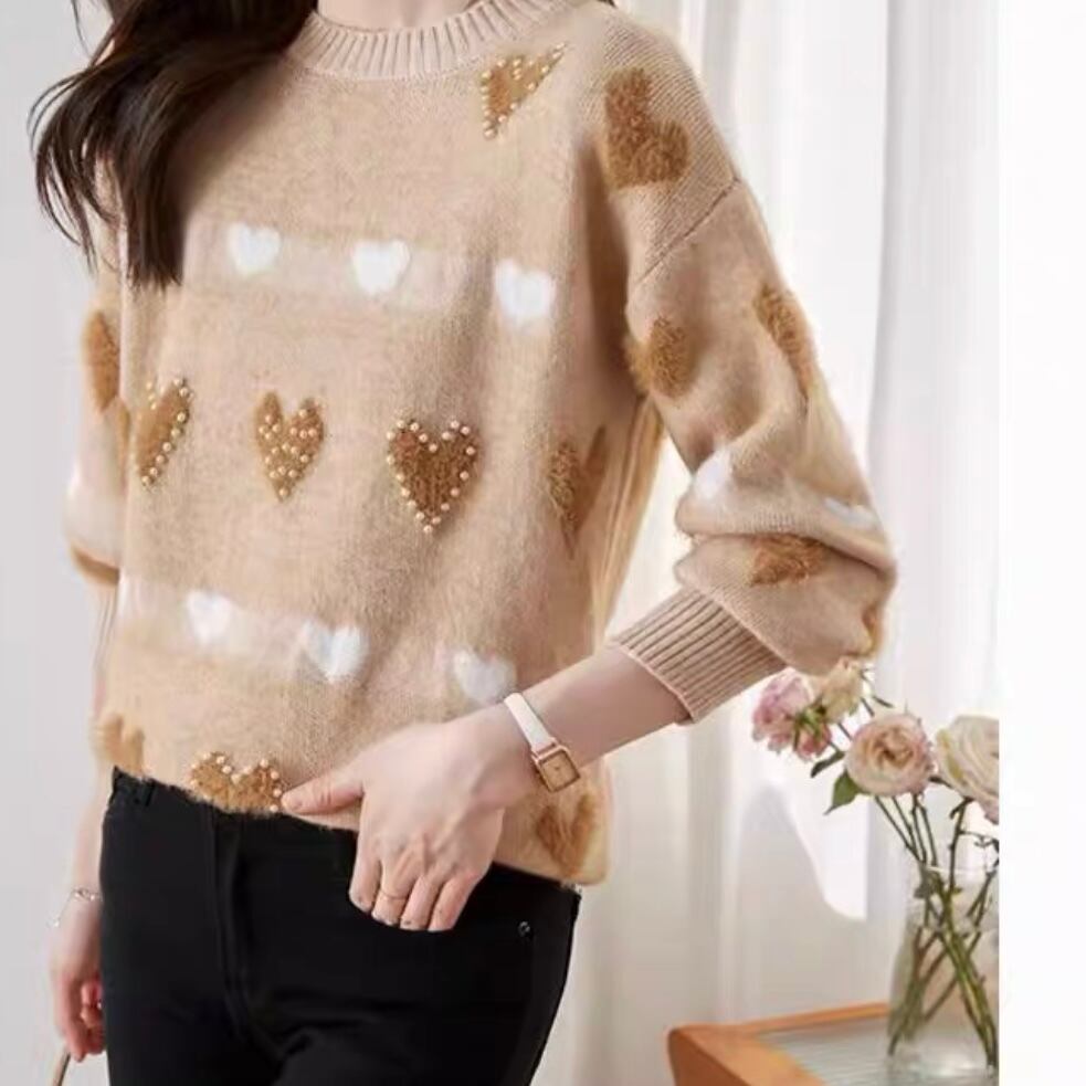 NT-0268 パール ハート ラウンドネック ニット トップス 長袖 レディース カジュアル シンプル 可愛い お洒落 きれいめ