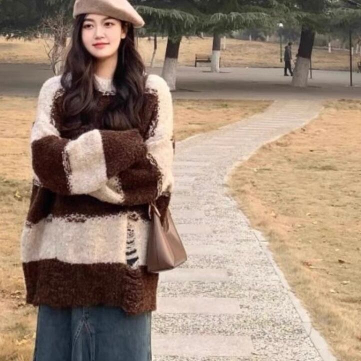 NT-0278 ブラウン ストライプ オーバーサイズ ニット トップス 長袖 レディース カジュアル シンプル 可愛い お洒落 きれいめ