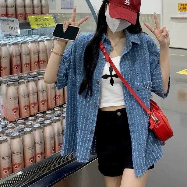 BL-0118 ビンテージ風 ストライプ デニム シャツ 半袖 トップス レディース カジュアル シンプル 可愛い お洒落 きれいめ トップス