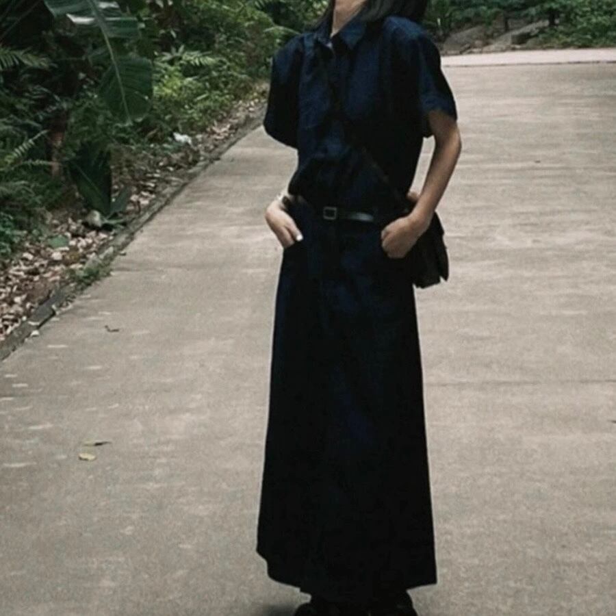 OP-0159 半袖 デニム シャツ ワンピース ロング丈 スカート レディース カジュアル シンプル 可愛い お洒落 きれいめ