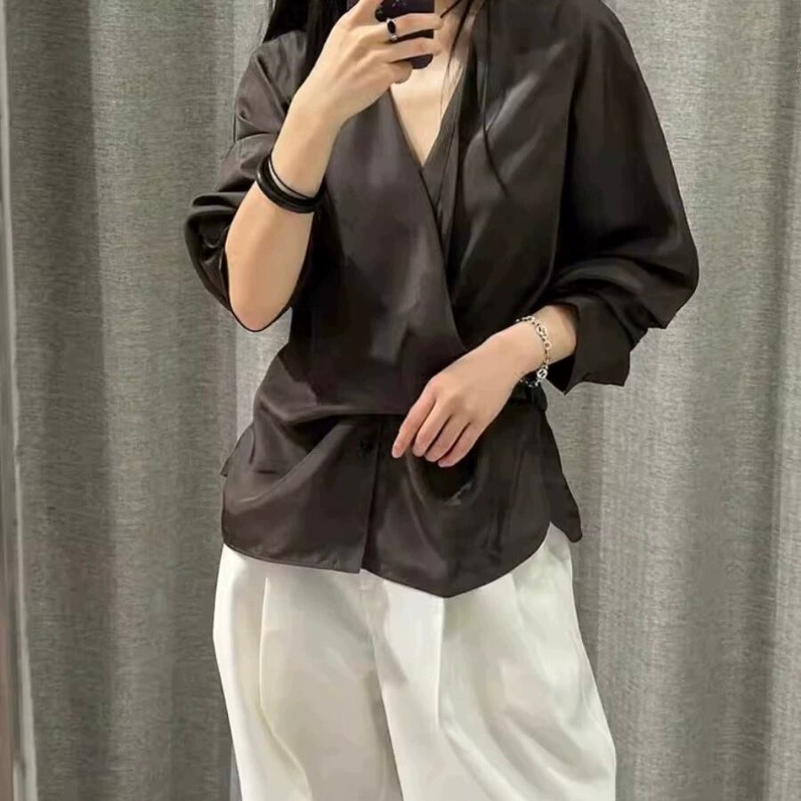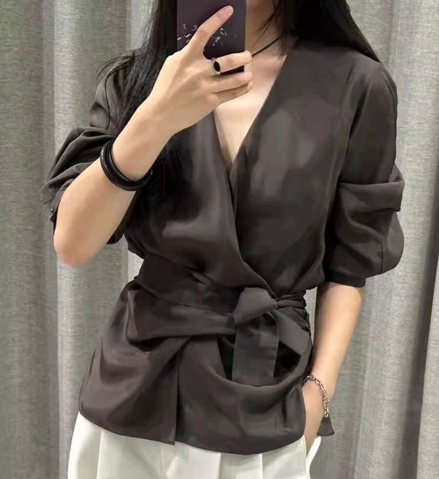 BL-0123 サテン シャツ ウエストマーク シースルー ブラウス 長袖 トップス レディース カジュアル シンプル 可愛い お洒落 きれいめ