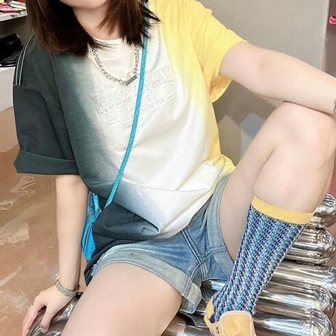 TS-0184 ネイビー イエロー グラデーション トリプルカラー 半袖 Tシャツ トップス レディース カジュアル シンプル 可愛い お洒落 きれいめ