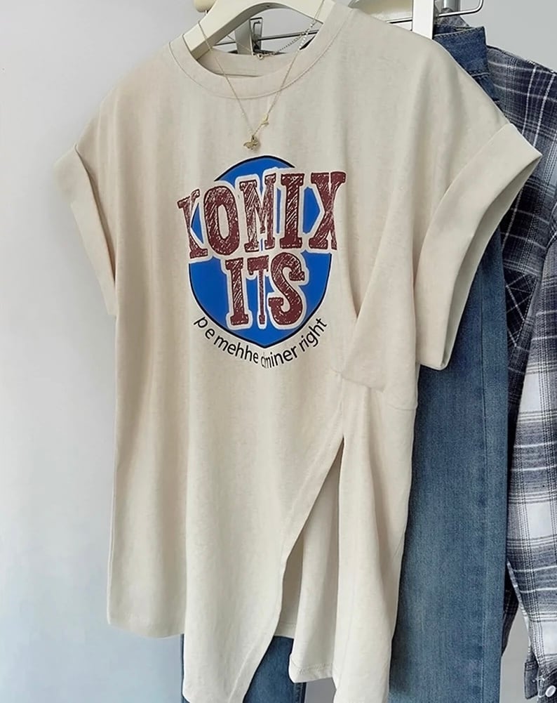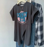 TS-0191 ハーフスリーブ スリット レタリング プリント 半袖 Tシャツ トップス レディース カジュアル シンプル 可愛い お洒落 きれいめ