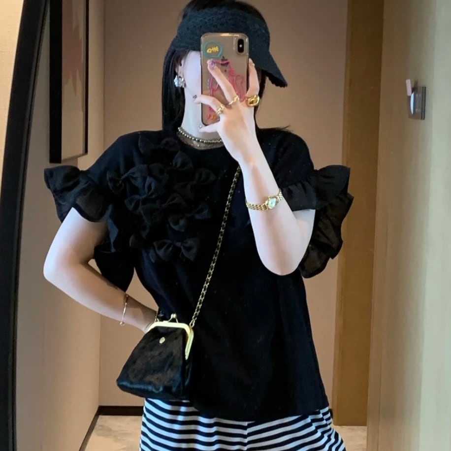 TS-0207 フリル ハーフスリーブ リボン ガーリー Tシャツ トップス レディース カジュアル シンプル 可愛い お洒落 きれいめ