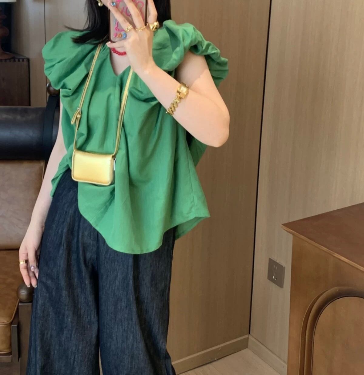 TS-0208 絞り袖 グリーン ハーフスリーブ Vネック Tシャツ トップス レディース カジュアル シンプル 可愛い お洒落 きれいめ