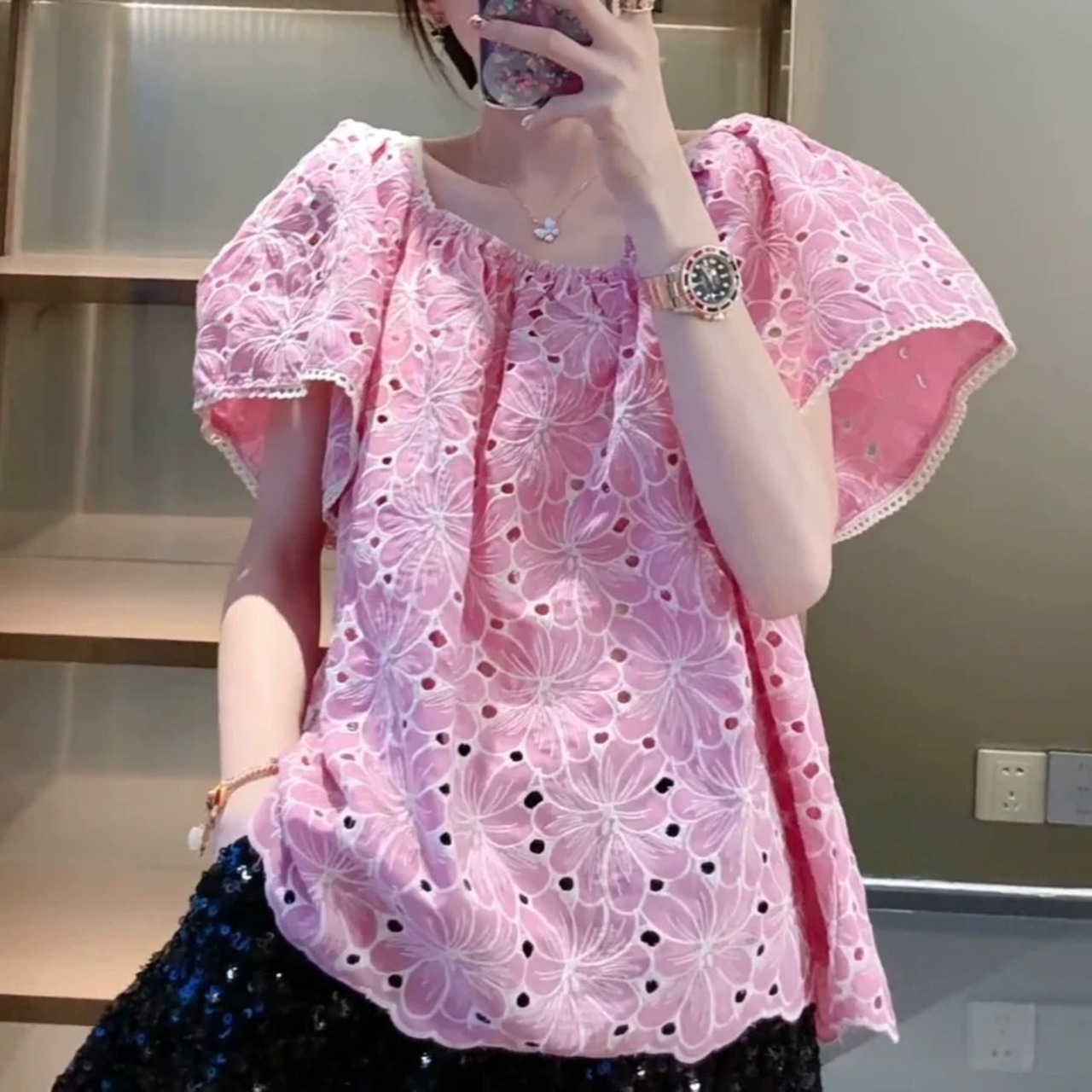 TS-0209 フラワー クルーネック 半袖 ピンク Tシャツ トップス レディース カジュアル シンプル 可愛い お洒落 きれいめ