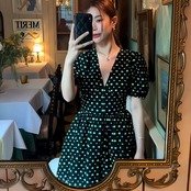 OP-0166 グリーン フラワー Vネック ショート丈 ウエストマーク Aライン ワンピース レディース カジュアル シンプル 可愛い お洒落 きれいめ