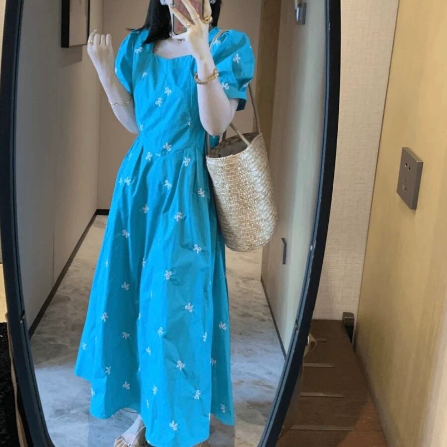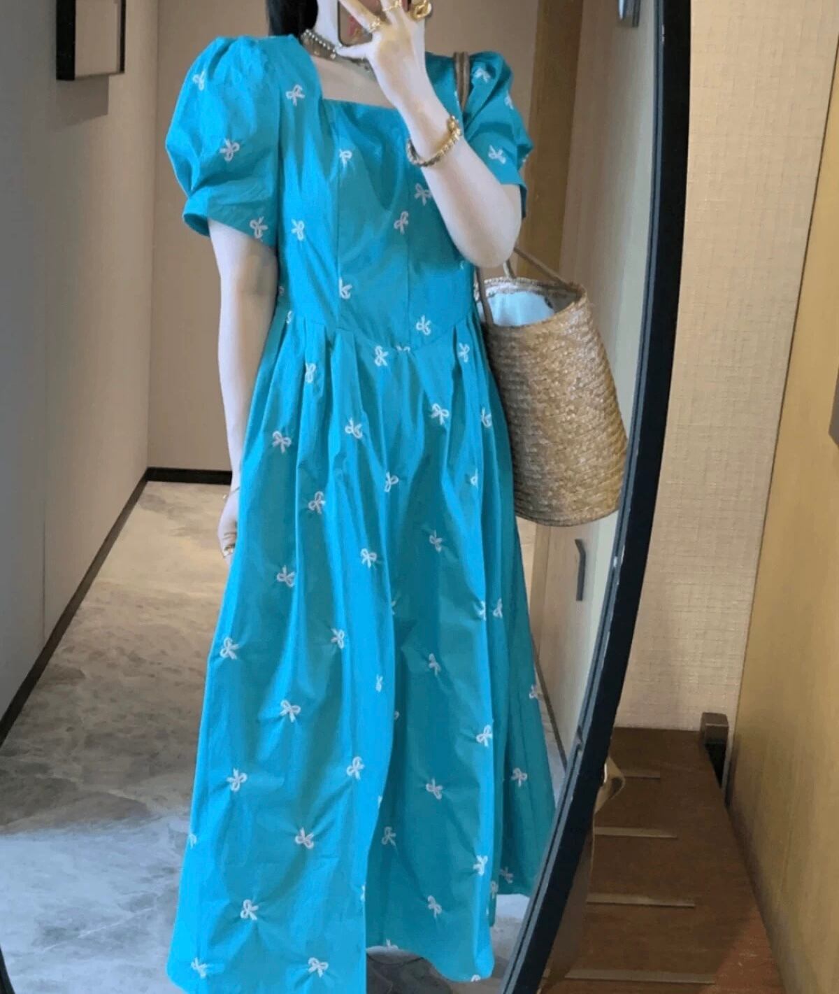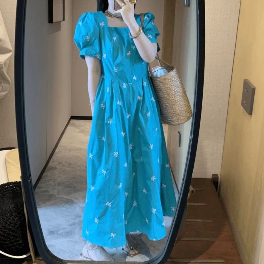 OP-0167 リボン柄 パフスリーブ ブルー スクエアネック ロング丈 ワンピース レディース カジュアル シンプル 可愛い お洒落 きれいめ