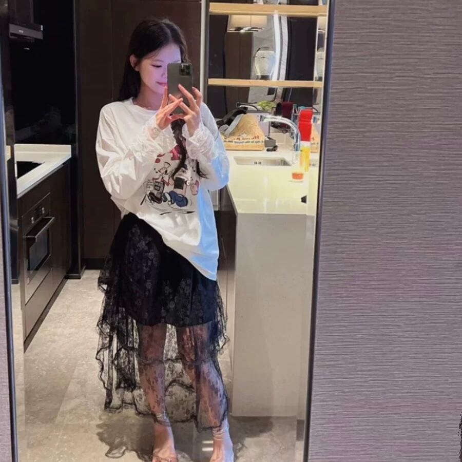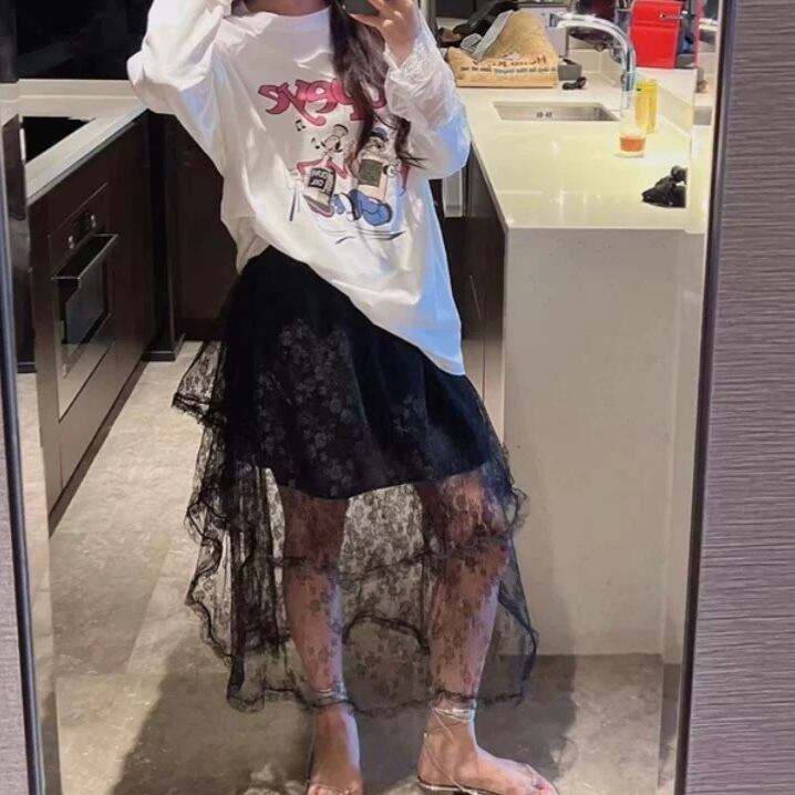 SK-0049 ブラック レース レイヤード スカート ロング丈 レディース カジュアル シンプル 可愛い お洒落 きれいめ