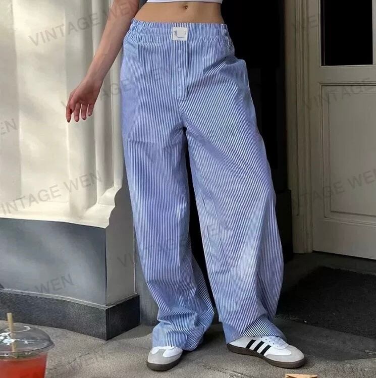 PT-0093 ストライプ ブルー ワイド パンツ レディース カジュアル シンプル 可愛い お洒落 きれいめ