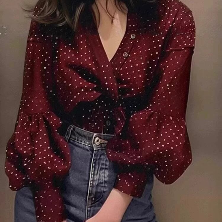 BL-0138 ドット柄 パフスリーブ Vネック シャツ 大人 長袖 レディース カジュアル シンプル 可愛い お洒落 きれいめ