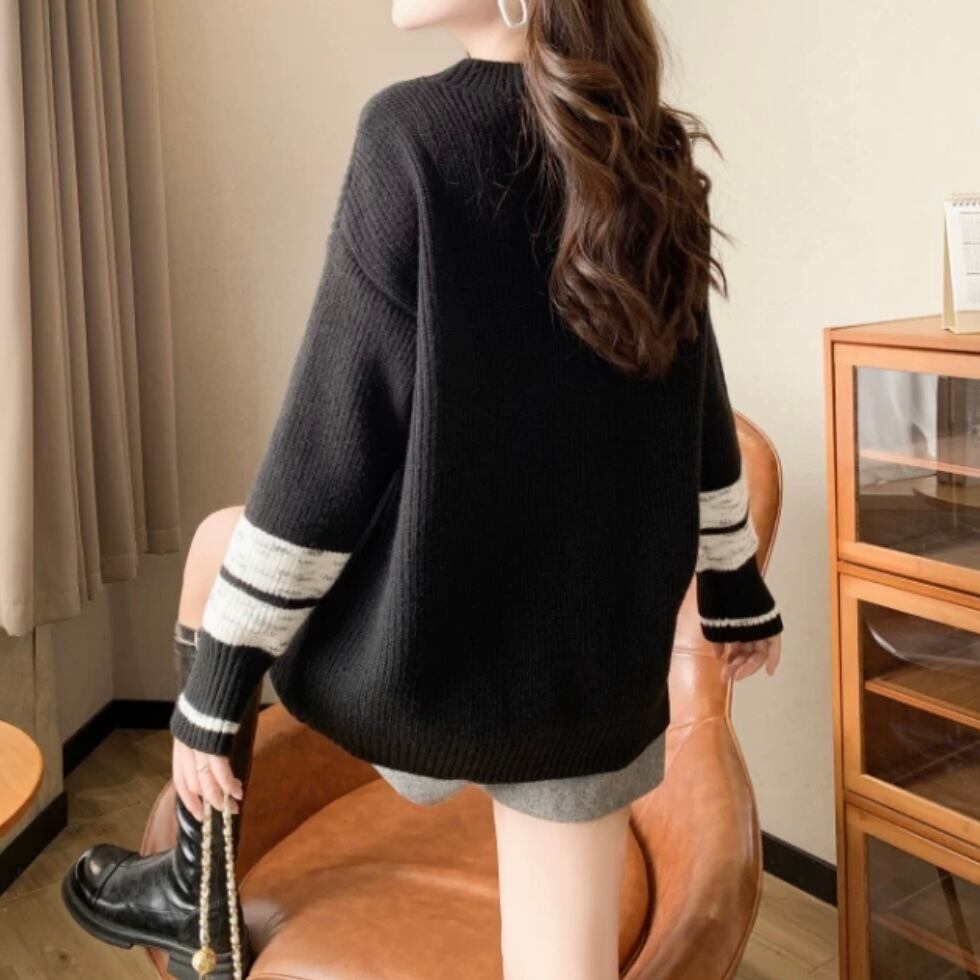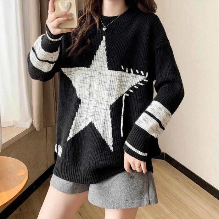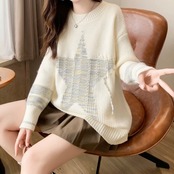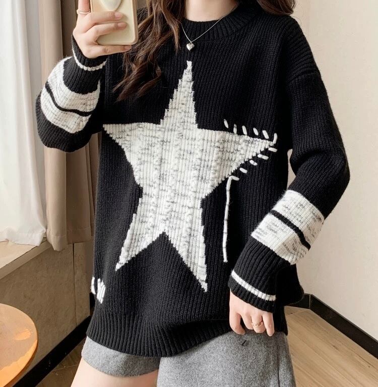 NT-0298 星 ライン バイカラー ラウンドネック ニット 長袖 レディース カジュアル シンプル 可愛い お洒落 きれいめ