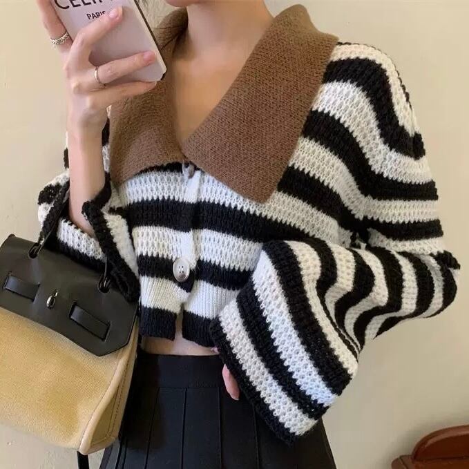 NT-0327 襟付き ショート丈 ストライプ カラーニット レディース カジュアル シンプル 可愛い お洒落 きれいめ 大人