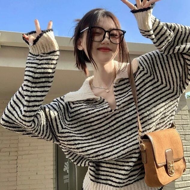 NT-0330 ストライプ柄 襟付き ニット レディース カジュアル シンプル 可愛い お洒落 きれいめ 大人